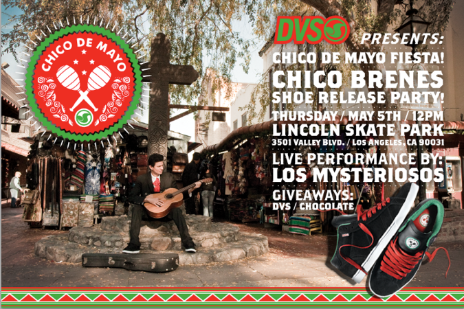 Celebrate Cinco De Mayo and Chico Brenes' new DVS shoe at Lincoln Skate Park on May 5th with a live performance by Los Mysteriosos.